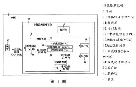 • 一種車載核心通訊介面系統及其方法(專利號I852197),申請日期2022/11/30,本發明主要目的在在透過整合車輛、設備管理平台與車載伺服器,優化各類電動車輛內部的訊息傳遞效率。該技術的核心在於處理器內建的程式間通訊介面,它能作為中樞連接用戶端與服務端,達成即時雙向通訊並強化整體管理效能。系統支援多樣化的應用程式與介面服務,如行車資訊、多媒體及車用區域網路(CAN bus)管理,並提供靈活的訊息封包廣播機制,確保資訊能精確且快速地在不同裝置間流通。