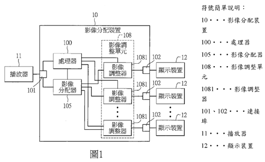 • 一種可調整輸出影像解析度的影像分配裝置(專利號M557859),申請日期2017/11/24,本新型主要目的在解決多個顯示器解析度不一而導致畫面無法最佳化的問題。該裝置透過內建的處理器主動讀取各個顯示螢幕的延伸顯示能力識別(EDID)資訊,並藉由多組影像調整器對分流後的訊號進行獨立縮放。這種設計讓單一影片來源能同時針對不同規格的螢幕,輸出各自對應的最佳解析度,確保每一台顯示設備都能呈現最清晰的畫質。此外,系統亦提供操作介面供使用者手動介入調整,讓影像分配在自動化之餘也保有靈活的控制彈性。