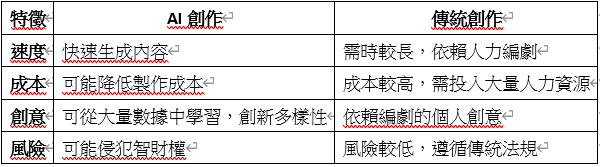 - 比較AI與傳統創作方法的優劣:下面的表格展示了AI創作與傳統創作方式的對比: