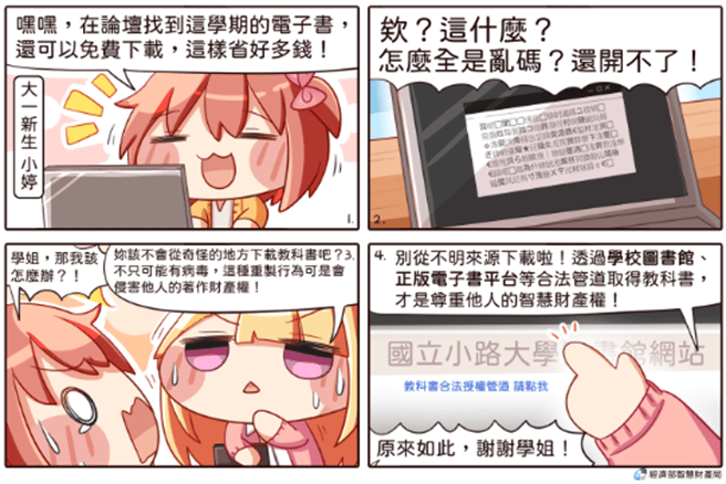 隨著學生使用筆電、平板或手機等行動載具作為上課及學習工具已日趨普及,提醒各位學生切勿下載或分享來路不明的電子教科書,否則將涉及著作權侵害而有民、刑事的法律責任。請透過學校圖書館、合法電子書平台等正當管道取得正版教科書,以實際行動支持智慧財產權。