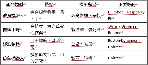 - 評估功能與性能:了解不同產品的功能,並比較其性能。例如,以下是幾種機器人產品的比較: