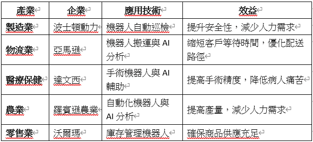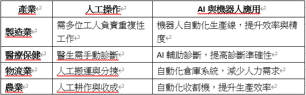 以下是AI與機器人在不同產業中的比較,展示其潛在的應用場景: