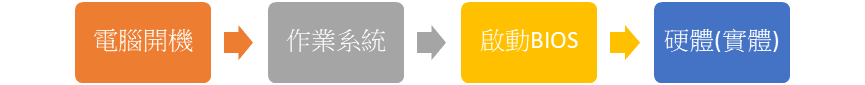 下圖的方向表示整體系統運作的過程,由此可知,BIOS介於OS與硬體之間,作為互動及協調溝通的管道。對於想要更多認識BIOS的同學,可以去看一下<維基百科>(https://zh.wikipedia.org/zh-tw/BIOS )。