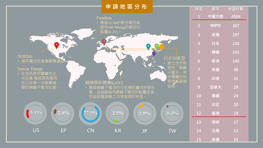 在淨零排放、數位轉型的趨勢下,鈉離子電池、5G與 AIoT成為全球科技競爭的焦點。本局委託財團法人專利檢索中心完成「5G與 AIoT 整合應用之專利布局分析」及「鈉離子電池專利技術分析」兩份專利分析報告。透過分析各國及各企業的專利布局,瞭解全球在相關技術研發上的競爭態勢,並找出臺灣產業在技術創新方面所面臨的挑戰與機會,以協助政府與企業制定更具針對性的科技發展策略,提升我國在全球價值鏈中的地位。